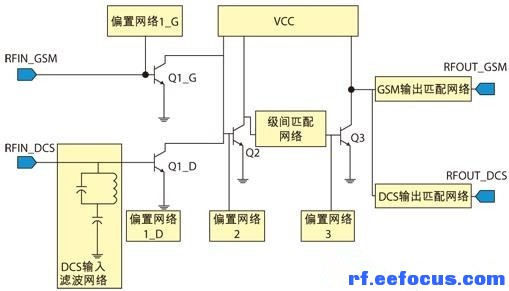 本文提出一种新颖的射频功率放大器电路结构,使用一个射频功率放大器实现GSM/DCS双频段功率放大功能,锐迪科的就是采用这种结构。射频功率放大器管芯由原来的两个减少为一个,同时此结构射频功率放大器及输出匹配网络与CMOS控制器、射频开关集成至一个芯片模块,组成GSM/DCS双频段射频前端模块,如图1所示。