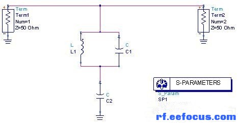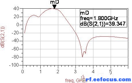 由于高频段(DCS)的增益在第二和第三级时略低,因此设计第一级放大电路时,DCS频段第一级增益比GSM频段第一级高约3dB。同时,在DCS频段射频输入端加入滤波网络,如图2所示。此滤波网络对GSM频段信号起到带阻作用,同时对DCS频段信号起到带通作用,加入此滤波网络可有效地提高交叉隔离度。该滤波网络的仿真原理图与仿真结果分别如图4、图5所示。本设计电路GSM频段和DCS频段总增益仿真结果如图6、图7所示。
