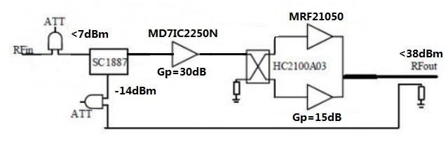 我打算用一级推放加一级对称Doherty功放实现,在加上SC1887作为模拟预失真,提高线性度。并在之前加入压控衰减器以实现增益可调。框图见附件。方案可能不成熟,芯片选择可能也并不合适,希望各位大虾多多指点。