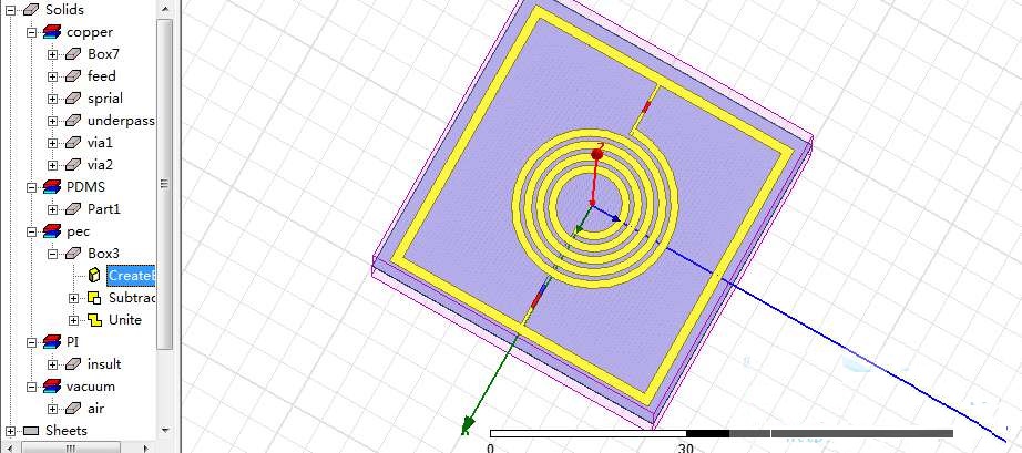 我现在自己建了个模型,从上往下,第一层为电感层,材料为铜,第二层为绝缘层,材料是聚酰亚胺,第三层为电极层材料也是铜,最后一层材料是PDMS,如下图: