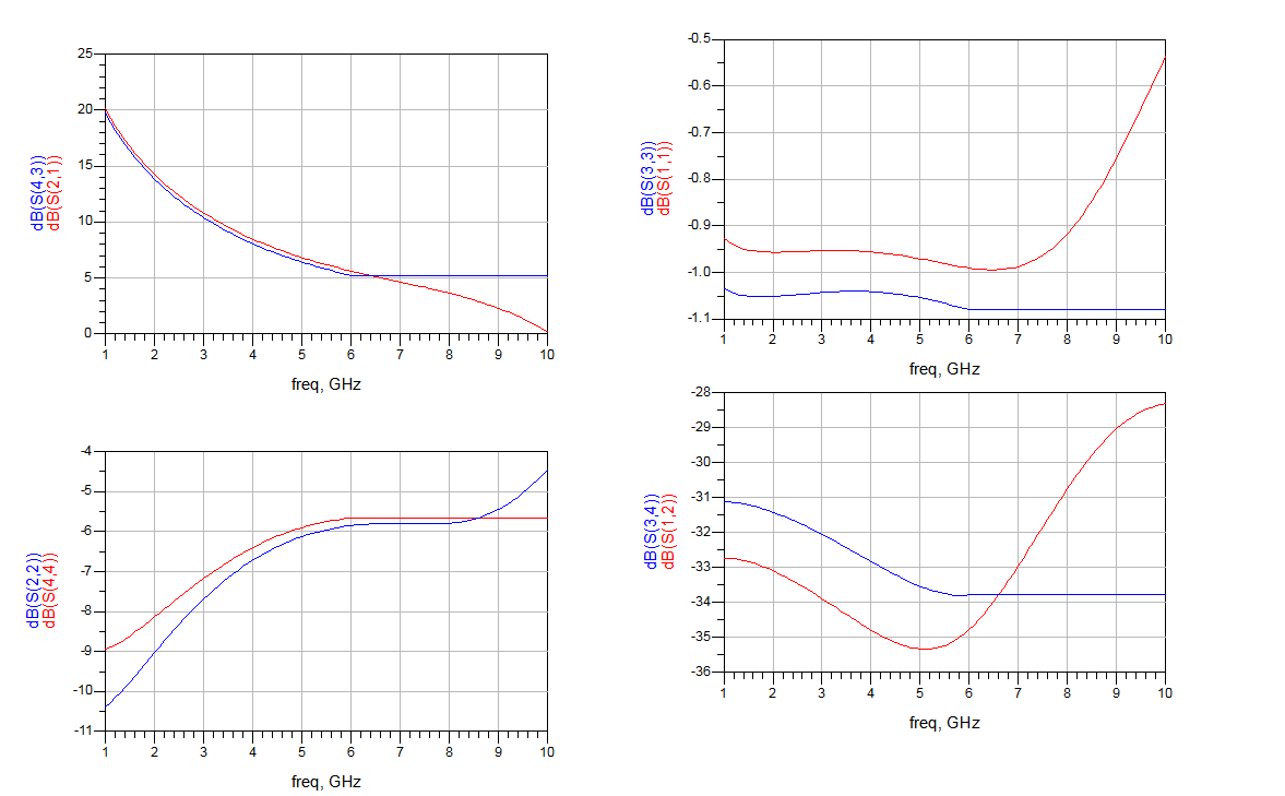 如下图:蓝色为那个功放管子官网上提供的s2p文件,红色 为大信号模型的图,请问两者差别大吗?