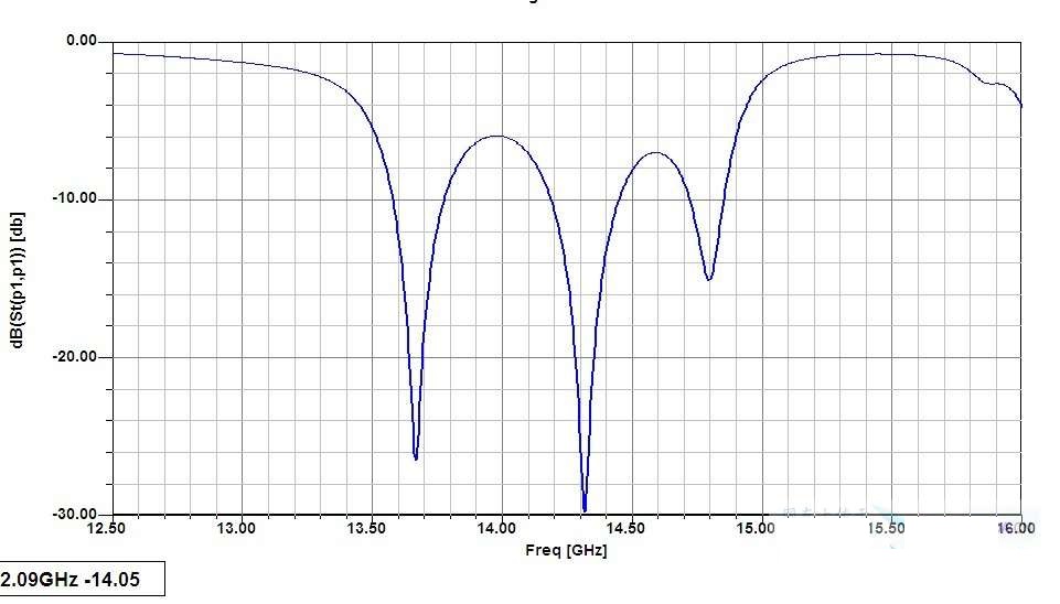 最后,一般的滤波器的调试和设计没有什么太多东西无非两点,一是内外耦合要配合,内耦合决定带宽,(对于此形式来说就是最中间的谐振器耦合),二是谐振器的长度和耦合度都是影响谐振峰偏移的直接原因,找到谐振峰应该在的位置就一切ok了