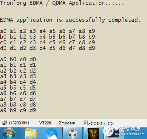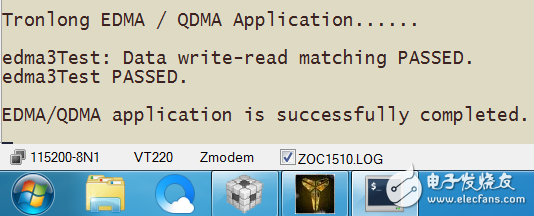 4. EDMA3 一维数据传输 :本程序的作用是实现了第三代增强型直接内存存取 EDMA3 一维数据传输功能,烧写成功运行以后,ZOC打印信息如下图所示。