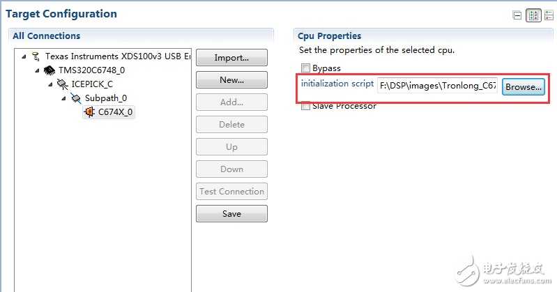 可看到仿真器驱动安装正确,重启CCS后还是不能进入Debug模式,打开Target configurations,进行仿真器连接测试,测试显示仿真器没有连接到目标板。折腾一番后发现原来是仿真器初始化脚本没有正确添加