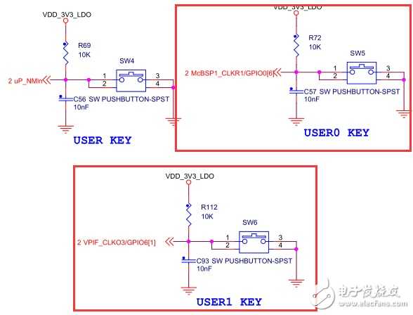 按键硬件电路:USER0 KEY 对应GPIO0[6]、USER1 KEY 对应GPIO6[1] 应用此按键分别控制LED D6、D7