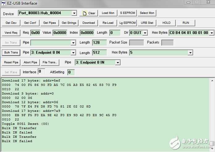 可是通过USB console 下载程序以后,点击 bulk trans要么trans failed 要么只能出现几个看似不太对的数据就不传输了。上图。求大神指导我一下,跪求了...我现在是用的开发板,如果验证可以的话,自己会画画板。现在卡在这了好痛苦。