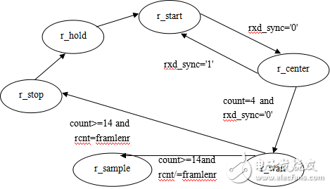 根据此次设计的设计思路,共对此状态机设定了六个状态:r_start(等待起始状态)、r_center(判断起始位状态)、r_wait(等待数据中点采样状态)、r_sample(数据采样状态)、r_stop(数据输出状态)和r_hold(输出采样完毕状态)。