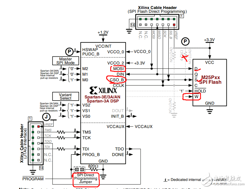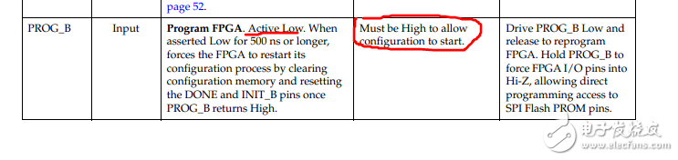 芯片是Spartan-3AN系列的,芯片资料上的配置电路如下图所示,在PROG_B引脚上有一个跳线“SPI Direct Programming Jumper",SPI直接编程跳线,我理解的意思是在使用SPI配置方式的时候是需要接上的,接上后PROG_B引脚被拉低了。但是在手册后面的引脚介绍中,第二栏中显示的是“During Configuration"是必须要拉高才能开始配置。那么在选择SPI配置的时候,PROG_B引脚到底是高是低?是高的话,为什么有一个Jumper出来?求大神指教!