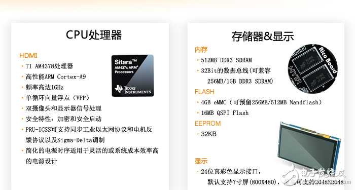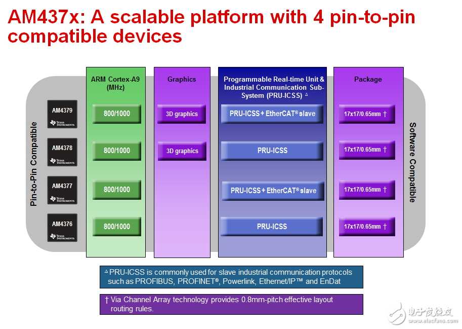 AM437X是TI(德州仪器)基于ARM Cortex-A9内核推出的一款Sitara系列处理器,该系列不但集成1GHz ARM Cortex-A9内核、四核可编程实时单元(PRU)和双摄像头,还支持许多针对自动化和工业驱动器的工业协议,例如EtherCAT、以太网/IP、Profibus、PROFINET-RT/IRT、POWERLINK、Sercos III、IEC61850等双通道同步工业协议,EnDat电机反馈协议以及适用于传感器和致动器的BiSS接口协议。可用于马达驱动、工业人机界面、可编程逻辑控制器、条形码扫描、医疗设备、便携式数据终端等工业类应用。 TI AM437X系列包含AM4376、AM4377、AM4378、AM4379四款pin-to-pin兼容的处理器,每款处理器都有提供800MHz和1GHz两种主频,同时在3D 图形加速及PRU-ICSS方面每款处理器的支持情况也有不同。