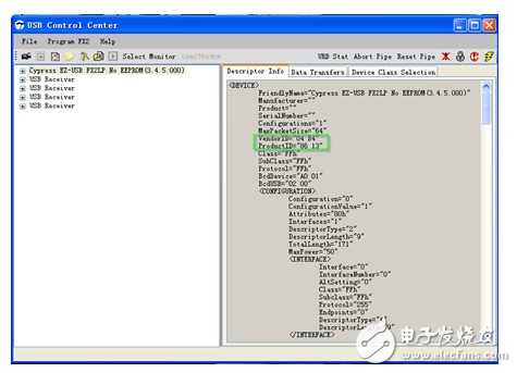 ① 点击“开始à程序àCypressàCypress Suite USB 3.4.7àControl Center”。打开后,我们看到立即识别了我们的FX2设备,如图13.10所示,Descripter Info中也列出了VID和PID,分别为0x04B4和0x8613。