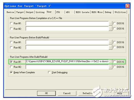 这里顺便提一下.iic文件的生成。在Keil中打开firmware工程后,进入“TargetOptions …”。如图13.11所示,在User选项卡中勾选“Run User ProgramsAfter Build/Rebuild”下的“Run #1”。