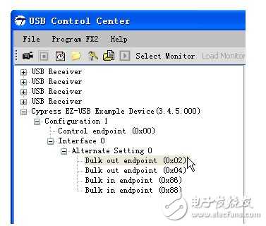 ③ 如图13.12所示,此时USB Control Center中识别到的设备变成了“Cypress EZ-USB Example Device”,展开后有4个可用端点。这里0x02和0x86是一对收发端口,0x04和0x88也是一对。