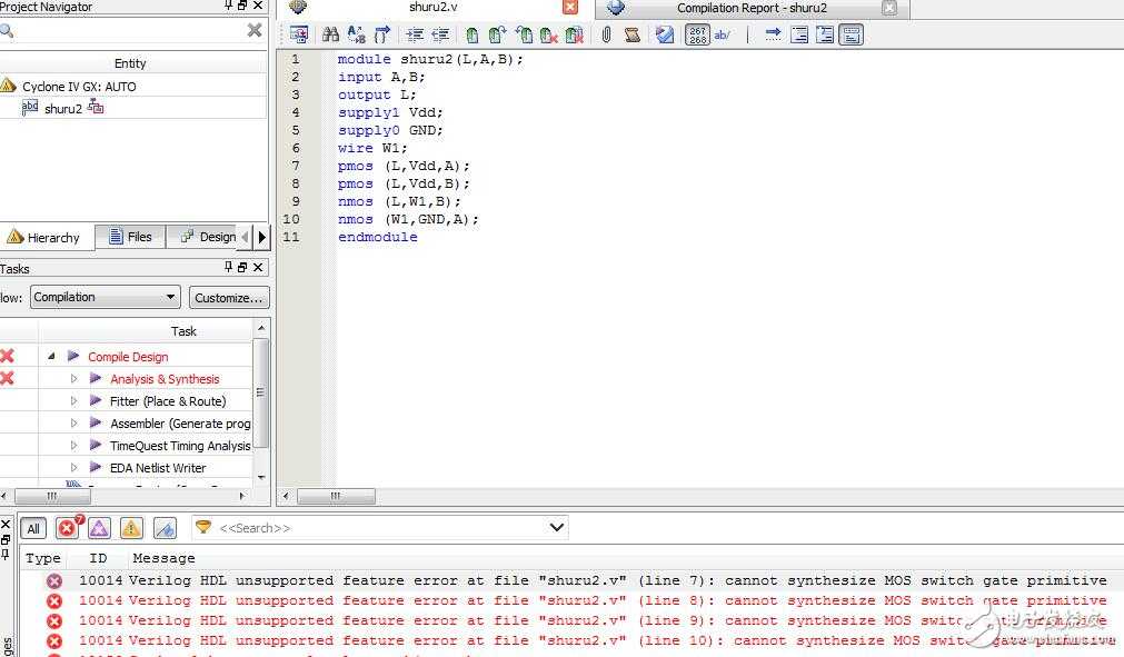如图,在书上看到的一个小例程,然后用quartusii V14.1对其进行综合,显示Verilog不能合成MOS开关门原语。这段代码是在康华光的第五版的数电上看到的啊,为什么不能综合?