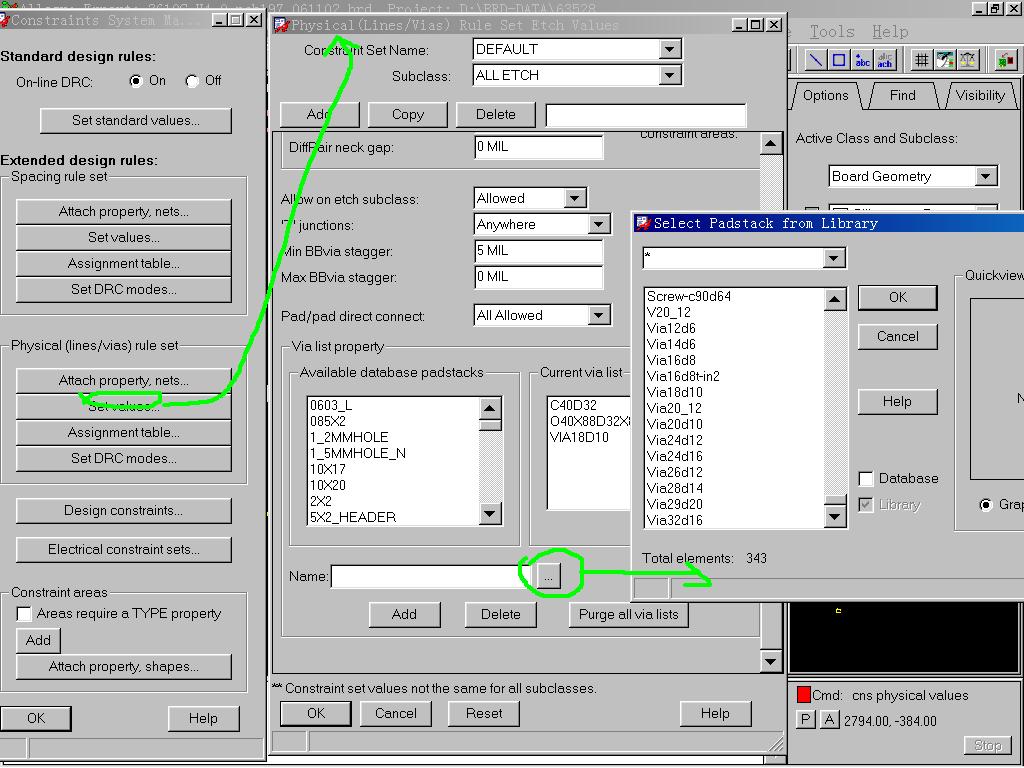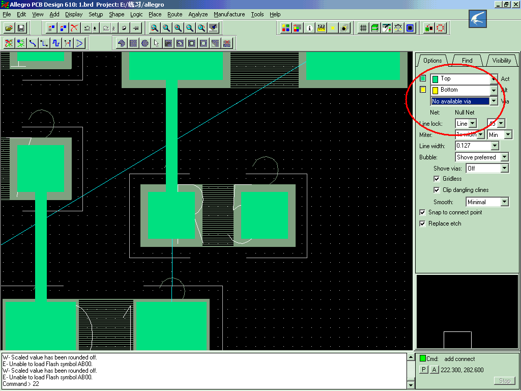 为何我拉线时加不了孔,在右边的控制面板中的VIA中提示:no aviailable via, 我估计是因为没有设置孔,但我不知道在哪设置孔,请高手指点,不胜感激!