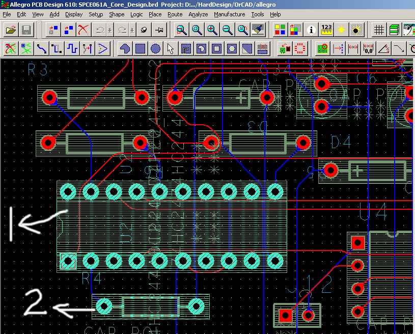 我是Allegro初学者,刚刚开始学习。自己把一个单片机核心板硬件电路画在Allegro里面了,但是有两个元件颜色怎么不一样?如下图,谢谢!