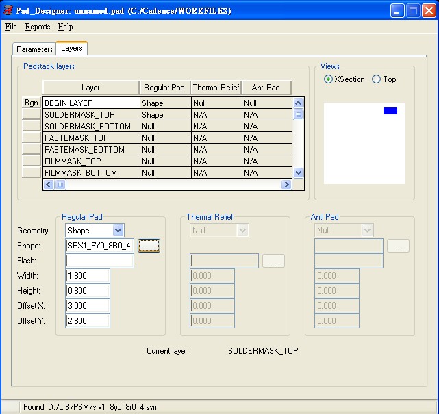 我先做一个名为srx1_6y0_6r0_3.ssm的焊盘尺寸用于regular pad,在制作一个稍大一点的命名srx1_8y0_8r0_4.ssm用于soldermask 当我给allegro做pad要保存的时候出现 pad stack origin outside all pad错误,请问该怎么处理?