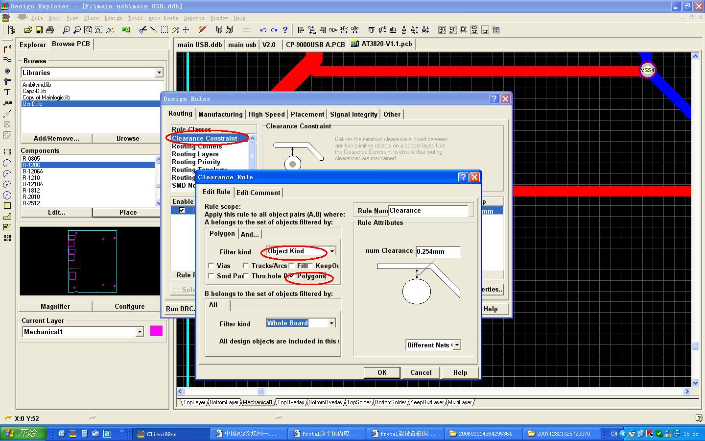 在Protel99SE或者DXP里面,没有小编所说的“design/clearance rule/、ALL下选择Object kind/polygons”