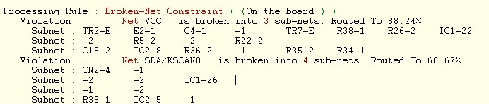 我布线完成之后,用DRC检查,结果出现了一些un-rotes net constraint,上面提示VCC没有连接好,但我查了一下,所有的VCC网络点都已经连接起来了,可怎么还是提示没有连接好呢?另外,*.DRC文件里面提示了一些信息,包括网络点,也包括一些负数字,那写负数字是什么意思呢?