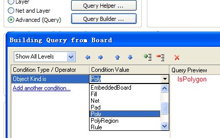 — 在上面的where the first object matches选项里选advanced,query builder>>下拉菜单-object kind is 后面选poly