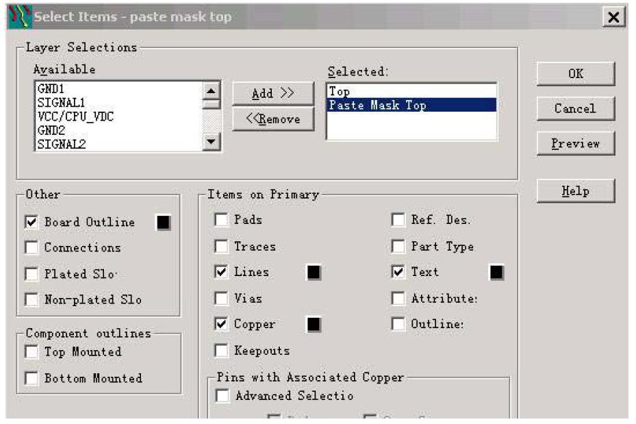 如图中paste mask top,它包含两层,在top层的Items on primary里选pads还好理解,可在paste mask top 层里选lines, coper, text是什么意思呢?