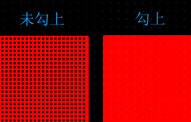 勾上的时候,铜皮会忽略网格和线宽的设置,直接填满铜皮。如图,hatch grid:50,line width:25