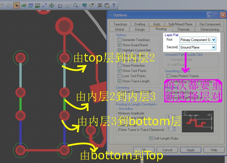 如上图,四层板,我的目的是看到用过孔在1-2,2-3,3-4这几个层之间切换。图中所示的倒是实现了这几个层间的切换。问题是: