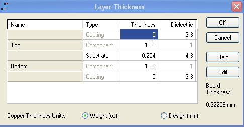 如图,是我在pads layout 2007中执行setup-layer definition命令后弹出的layers setup对话框中再点击thickness按钮,弹出layer thickness对话框,如下图,图中右下角的board thickness:0.32258mm是指我的整块电路板的厚度吗?(不包括元器件),如果是的话,会不会太薄了?