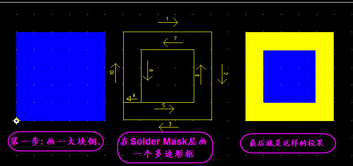 方法就是用copper pour画在bottom层,点2D线工具用rectangle(当然你也可以用别的模式)在Solder mask bottom层画个矩形不就得啦!