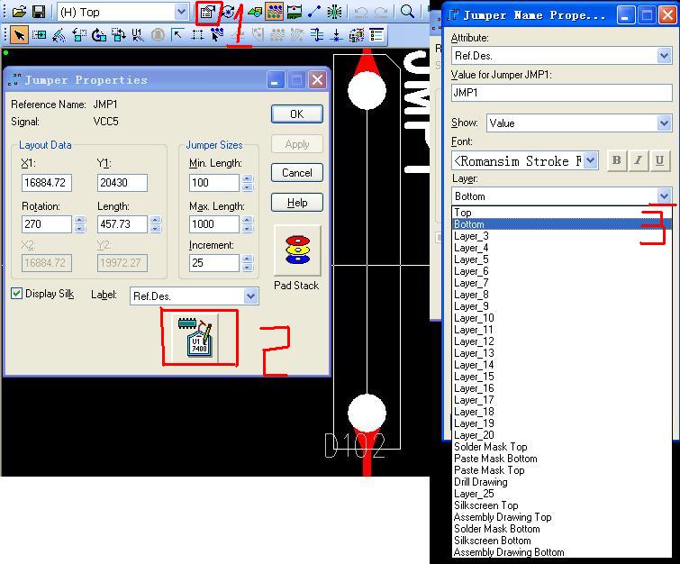 在PADS2005或PADS2007里,走线时按右键Add Jumper,跳线的丝印显示在TOP层, 怎样将其显示改为BOTTOM层呢?因为我的PCB(单面板) TOP层是SMD元件,BOTTOM层才是插件元件。