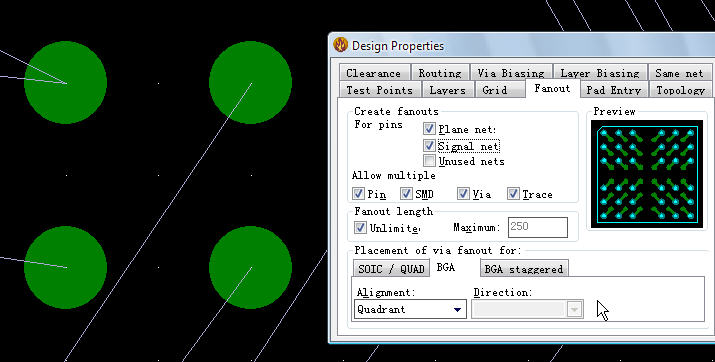 见下图,格点也设置好了,via也有选择,设置如右边所示,不知为何不能扇出?软件方面没问题吧?