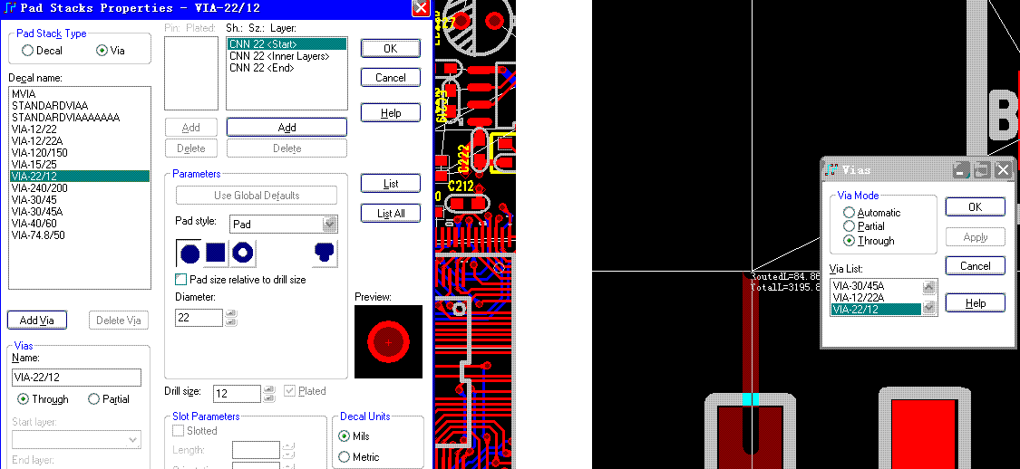 过孔在setup中设置了(如左图);但是布线时没法添加过孔(如右图)
