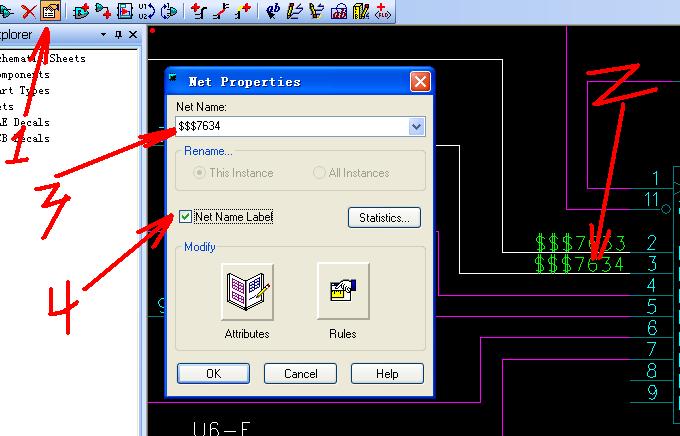 其中第二步,一定要点离开元件的第一段连线,第三步修改为你定义的网络名,第四步勾上使网络名显示出来