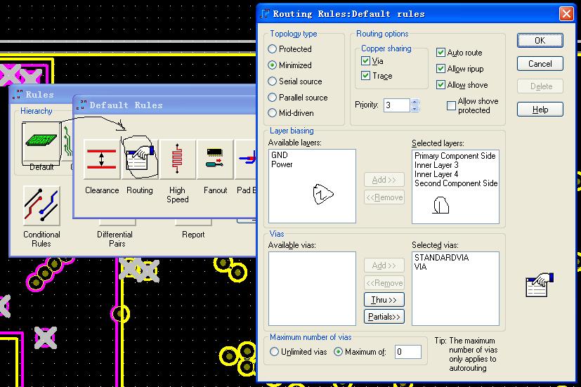 正在学习四层板的布线,碰到一个想不通的问题。我把第2层设为CAM Plane(分配网络为地),布线层对如图,DRC设为prevent errors。从某个焊盘开始用动态布线方式布线,拉出一段线后,放置了一个过孔(通孔),再继续拉线,居然能在CAM Plane层走线(图中绿色的线),这条线不是地网络,而且CAM Plane层是不能走线的,这2点都是明显有错误的地方,为什么DRC不起作用呢?