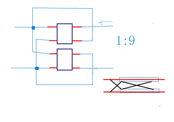 目前做一个推挽结构的宽带功放,这个是用于匹配的9:1阻抗变换器。用路的方法分析,很容易分析出4:1推挽结构的原理(即得出输出电流是输入电流的两倍),传统的9:1和平衡到不平衡结构也可以用类似的方法分析出来,但是这个已在应用的电路确研究了半天也没搞清楚到底是什么原理,ads仿真虽然基本符合9:1规律,但是弄不清原理还是不爽,恳请各位指点一下