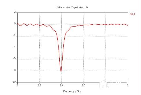 该 CST 自带的例子贴片天线,仿真频率2-3GHz。仿真后得到天线的S 参量信息如下:在2.4GHz 的频率下产生谐振峰值。