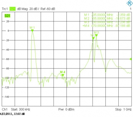 输入0dBm的235MHz信号,信号源2次谐波470MHz为-51dBm。