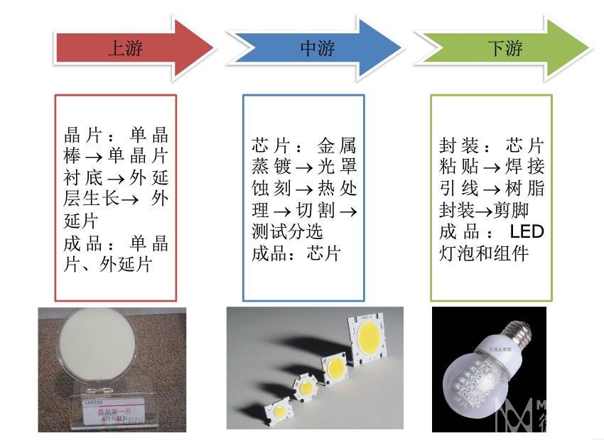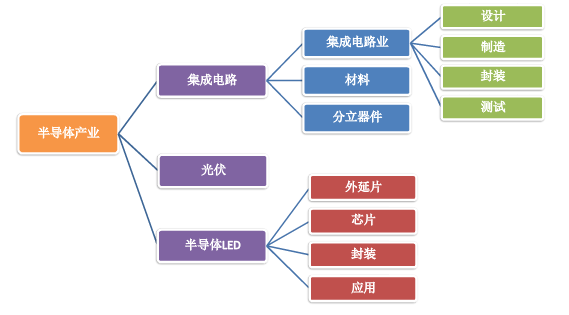 中国集成电路市场规模2015年中国集成电路市场规模达11024亿元,同比增长6.1%,成为全球为数不多的仍能保持增长的区域市场。2015年中国集成电路市场增长的主要动力来自于汽车电子、工业控制以及通信设备等细分市场。消费电子领域和传统家电市场产销量都基本保持稳定,在消费升级以及家电智能化趋势带动下,集成电路市场略有增长。该领域市场的主要增长动力来自于以智能手环、智能手表为代表的智能移动设备的增长,以及无人机等新兴消费电子产品的快速增长。汽车电子是近几年全球集成电路市场的热点领域。2015年,中国汽车产量达到2450.4万辆,同比增长3.3%,其中新能源汽车产量达34万辆,同比增长330%。在汽车产销量上涨以及国产自主品牌汽车快速成长的带动下,中国汽车电子领域的集成电路市场增长32.5%,成为仅次于工业控制领域增长第二快的市场。2015年,中国集成电路产业全年销售额达到3690.8亿元,设计、制造、封测三个环节销售额分别为1325亿元、900.8亿元及1384亿元,其中设计和制造环节增速明显快于封测,占比进一步上升,产业结构更趋平衡。 虽然国内集成电路产业的增长非常迅猛,国内企业的实力也大幅度提高,但是国内集成电路市场的自主可控程度仍不容乐观。据海关统计,2015年进口集成电路3139.96亿块,同比增长10%;进口金额2307亿美元,同比增长6%。出口集成电路1827.66亿块,同比增长19.1%;出口金额693.1亿美元,同比增长13.9%。2015年进出口逆差1613.9亿美元。国内集成电路产品的自给率偏低的情况仍然没有得到明显改观,国内集成电路产业发展任务依然艰巨。中国集成电路产业园分布北京,集成电路设计业产值272亿美元,增速高达59.81%,设计企业约90家,只有一个小小的中关村貌似承载不了这么大的需求,于是北京市砸下40亿,开始集成电路产业空间布局,北设计、南制造,京津冀协同发展。在海淀北部,依托北大、清华、中科院、北航、北理工等大专院校的人才、智力、项目、资金的优势,建立国家级的集成电路设计园;在北京的南部,北京经济技术开发区建立集成电路生产制造基地;在河北正定建立集成电路封测基地,形成了京津冀协同发展的大格局。 厦门,依托的资源是台湾人才。紫光集团总投资40亿元,在厦门建设紫光科技园暨展锐大厦,总建筑面积超过40万平方米,集研发设计、产业孵化、产品展示等功能于一体的集成电路产业集聚地,并有望成为国家级集成电路产业基地。数据显示,目前厦门市集成电路产业已集聚近70家企业,2015年产业规模达56亿元,初步形成了覆盖“芯片研发设计、制造、封装、测试、装备与材料”等环节的完整产业链。南京,今年6月总投资达30亿美元的德科码半导体产业园项目正式在南京经济技术开发区奠基,将建设8寸晶圆厂2座、12寸晶圆厂1座,以及封装测试厂、设备再制造厂、科研设计中心和配套生活区等。此前的3月28日,总投资同为30亿美元的台积电南京项目签约落户江北新区。两大“30亿美元级”的世界领先企业先后投资南京,在带给中国大陆最先进生产工艺的同时,也将填补南京市集成电路产业发展中的关键短板,使南京一举进入全国集成电路重点城市第一方阵。四川,从2016年中国成都集成电路产业发展高峰论坛暨菁蓉港·核芯空间启动仪式上获悉,四川省集成电路和信息安全产业投资基金于今年5月26日成立,可投资规模已达到100亿至120亿元之间,基金单个项目最低投资额不低于3000万元。核芯空间立足双流、覆盖成都、辐射西南,聚焦提供专业化、区域化的集成电路公共服务。重庆,集成电路确实成了香饽饽。重庆万国半导体12英寸功率半导体芯片制造及封装测试生产基地,落户重庆两江新区水土工业开发区,该项目总投资10亿美元,预计明年下半年开始封装生产。项目的布局有助于重庆打造国家重要集成电路产业基地,促进重庆电子信息产业从笔电基地到“芯屏器核”智能终端的全产业生态链布局。贵州,贵州与美国高通公司合作,其中重要的一项就是成立合资企业——贵州华芯通半导体技术有限公司。对于该公司的未来发展,贵安新区未来将会提供哪些支持?贵安新区管委会主任马长青在答记者问时表示,贵安新区将落实大数据产业优惠政策,在科技创新、人才引进、产业发展方面给予重点支持,提供优质的服务。马长青说,这次签约是一个崭新的开始,贵安新区对未来发展充满了信心,将以此为契机,建成集成电路产业园,以良好的条件吸引国内外上下游企业入驻,促进集成电路产业的发展。合肥,龙芯国产计算机产业园项目签约仪式在合肥市政务中心举行。据悉,龙芯国产计算机产业园项目将依托“龙芯”CPU和“龙芯”服务器自主创新技术,进行高性能国产计算机产业联合开发。三、半导体LED产业链介绍LED(Lighting EmittingDiode)即发光二极管,是一种半导体固体发光器件。它是利用固体半导体芯片作为发光材料,在半导体中通过载流子发生复合放出过剩的能量而引起光子发射,直接发出红、黄、蓝、绿、青、橙、紫、白色的光。LED照明产品就是利用LED作为光源制造出来的照明器具。