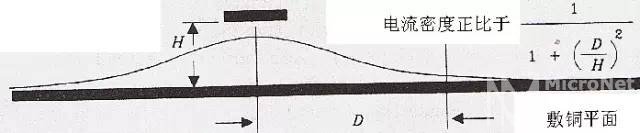 图3.2 PCB敷铜平面上高频电流路径对传输线来说,感抗最小的返回路径,也就是高频电流返回路径,就在信号布线的正下方的敷铜平面上,如图3.3。这样的返回路径使得整个回路包围的空间面积最小,也就使得此信号形成的环形天线向空间辐射的磁场强度(或接收空间辐射的能力)最小。对于比较长、直的布线,可以看作理想的传输线。在其上传播的信号返回电流流经范围是以信号布线为中心轴的带状区域,距离信号布线中心轴距离越远,电流密度越小,如图3.3。这一关系近似满足式3.3 [4]: