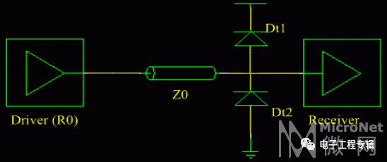 电阻与电容相连,电阻另一端接信号,电容另一端接地。电阻应等于走线特性阻抗,容值通常较小(20pF-600pF)。对差分信号只需三个原件,两个电阻加一个电容。优点:①适用于分布式及总线型负载;②完全吸收发送波,消除反射;③具有很低的直流功率损耗。缺点:①会降低高速信号的速率,增加信号延时;②RC电路的时间常数会导致电路中存在反射;③对于高频、高速短路要慎用;④使用两个器件,增加布局、布线难度。5、二极管端接匹配: