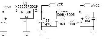 上面这个电路是mp3中给矩力2085,2051,2091等主控提供1.5v基准电压的稳压电路,1.5v基准电压要求是非常纯净的直流电压,里面绝对不能有交流变化的电流成份!这个图中通过一个1.5v稳压IC把从3脚输入的AVCC3v电压稳定到1.5v从2脚送出来,但是里面可能会混杂有变化快慢不同的变化电流干扰1.5v电压的稳定性,所以必须要用电容把交流成分给滤除掉,电路图中的C1 C2 E1和22欧姆的电阻等就是为了把里面的变化快慢不同的交流电电流直接入地而滤除掉,这样提供的1.5v电压就成了纯净的稳定直流电压了!下面这个电路中的所有电解电容和瓷电容的作用也都是起到相同的作用: