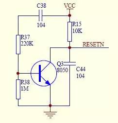 有两个电容 C38、C44在这个电路图中,C44是滤波电容不多讲了,重点讲一下C38,在开机的一瞬间,vcc的3v电接通给c38充电,电流通过流过充电电路到三极管的基极,三极管基极瞬间得到一个正电压,于是三极管导通相当于三极管的发射极和集电极接通,resetn就相当于与地接通,电压为0v,随着c38电容充满了电(时间是根据C38大小决定的,大了时间就长,小了时间就短,104的电容要充满点的时间在这里要0.2秒-0.5秒),三极管基极的电压就变为0v,三极管关断,resetn处的电压随之升高到3v,完成主控复位工作!长按二维码识别关注