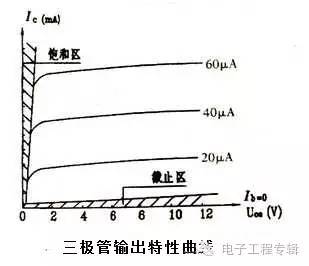 该曲线表示基极电流Ib一定时,三极管输出电压Uec与输出电流Ic之间的关系曲线,如下右图所示。图中的每条曲线表示,当固定一个Ib值时,调节Rc所测得的不同Uec下的Ic值。根据输出特性曲线,三极管的工作状态分为三个区域。截止区:它包括Ib=0及Ib〈0(即Ib与原方向相反)的一组工作曲线。当Ib=0,Ic=Iceo(称为穿透电流),在常温下此值很小。在此区域中,三极管的两个PN结均为反向偏置,即使Uec电压较高,管子中的电流Ic却很小,此时的管子相当于一个开关的开路状态。饱和区:该区域中的电压Uec的数值很小,Ube〉Uec集电极电流Ic随Uec的增加而很快的增大。此时三极管的两个PN结均处于正向偏置,集电结失去了收集某区电子的能力,Ic不再受Ib控制。Uec对Ic控制作用很大,管子相当于一个开关的接通状态。放大区:此区域中三极管的发射结正向偏置,而集电极反向偏置。当Uec超过某一电压后曲线基本上是平直的,这是因为当集电结电压增大后,原来流入基极的电流绝大部分被集电极拉走,所以Uec再继续增大时,电流Ic变化很小,另外,当Ib变化时,Ic即按比例的变化,也就是说,Ic受Ib的控制,并且Ic变化比Ib的变化大很多,△Ic和△Ib成正比,两者之间具有线性关系,因此此区域又称为线性区。在放大电路中,必须使用三极管工作在放大区。由三极管的三种状态产生了三极管的两个应用场合:放大电路和开关电路。长按二维码识别关注