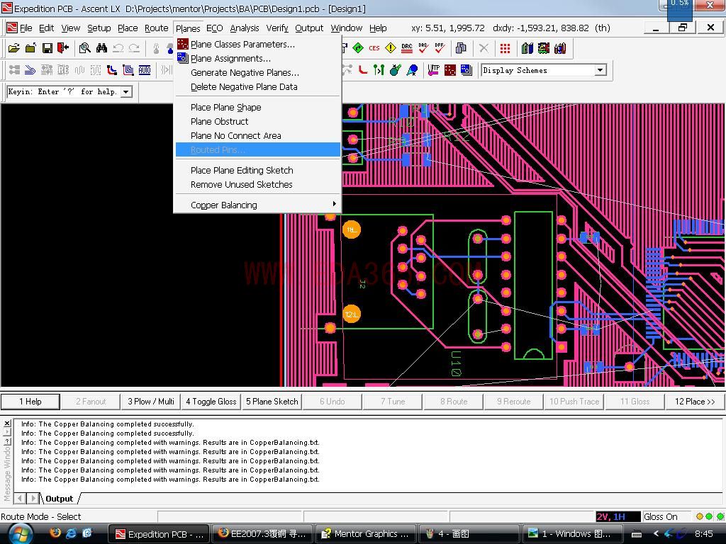 我在EE2007.3中画了一个板但没法覆铜,拿了一个简单电路做例子,我的操作如下图,先是Place Plane Shape,然后处理,由于做一个测试电路,只用了双面板,只能用Positive(正片覆铜)。但处理的结果好像成了负片覆铜,什么原因?我那弄错了吗?Routed Plan Pin 是灰色的,请指教!