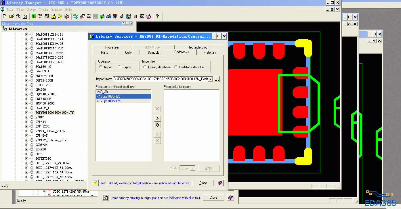 原来是在库管理器里找到菜单“tools"->"library service" ->"padstack" 从这个导入刚才生成的padstack.hkp 文件。 成功后同样的在"cell"里导入cell.hkp.