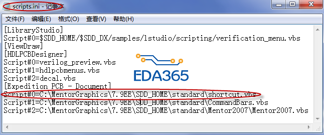 1.用记事本打开C:\mgc\EE7.9.3\7.9.3EE\SDD_HOME\standard\automation\startup\scripts.ini文件,在里面添加