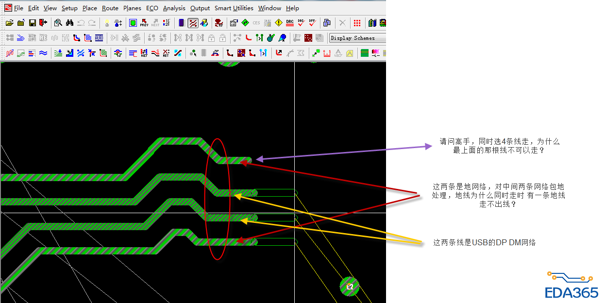 最外面两根是地线,对中间两根USB的DP DM线进行包地处理,地网络走线如何可以同时走两条了?