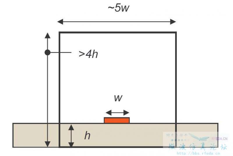 至于为何选择五倍的宽和四倍的高,高度的选择是根据介质基片的介电常数而来的,介电常数越高,向外辐射的能量越小,高度就可以设得小一点。