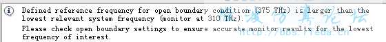 用open以及open add space边界条件的时候请注意,这种边界条件默认的只适用于中心频率,如果自定义非中心频率的monitor,请在边界条件设置框里有专门针对open边界的特殊设置,将里面改成center and monitors 就不会出现上面的警告了。
