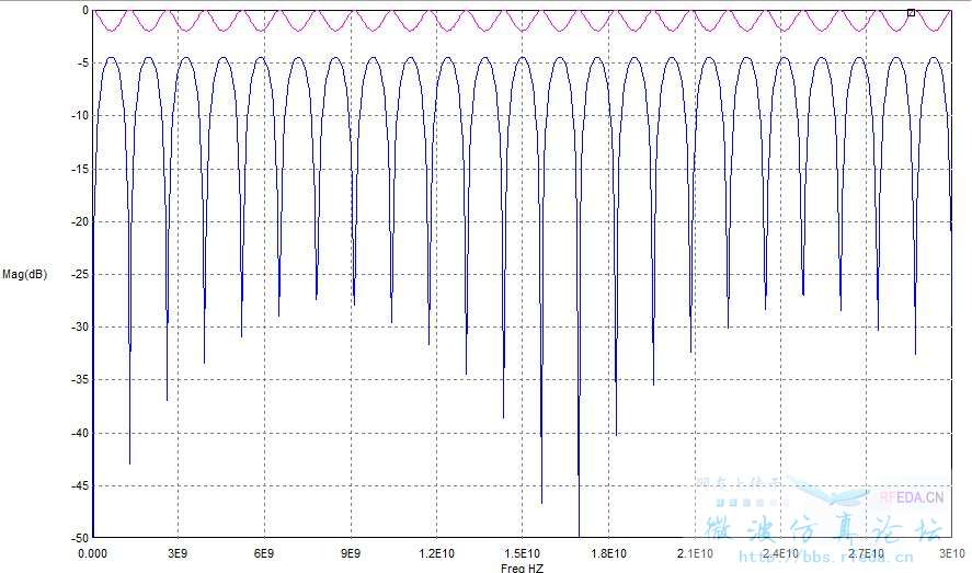 然后电长度每到180°的整数倍,就会谐振一次,谐振结果就是一个端口直接看到另一个端口,恰好50欧姆对50欧姆匹配,S参数达到极值