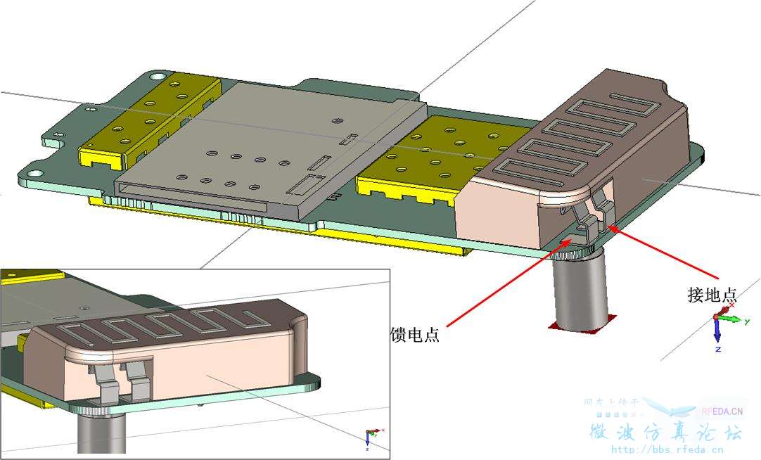 这个是个电视卡数据采集天线,频段在719MHz,结构如图所示,我已经将接地点和其他的地相连,准备设计成倒F天线,但是怎么感觉信号压根就全反射回来了?大家看看该怎么设计馈电和接地,以完成仿真?